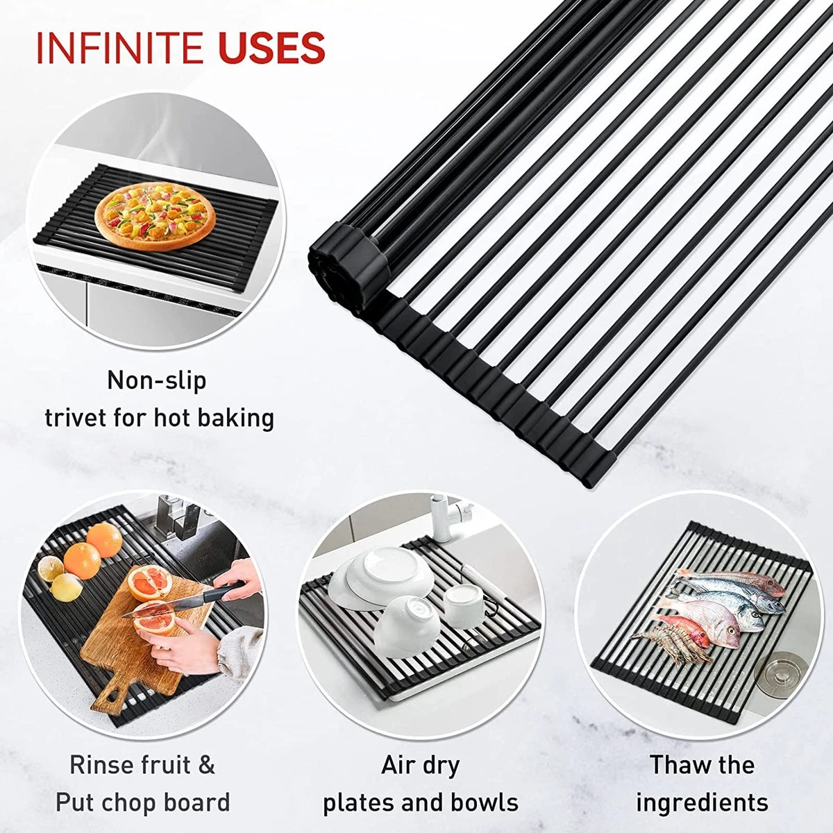 All-In-One Over The Sink Drying Rack: Multifunctioneel keukenmateriaal – schotel droogrek, onderzetter, warmte-isolatiemat, vergiet, voorbereidingsruimte, afvoer van overbewaterde bloempotten – alles in één! Dit opklapbare afdruiprek kan niet alleen worden gebruikt als afdruiprek voor het aan de lucht drogen van keukengerei, zoals afgewassen kommen, pannen, glazen, kopjes, platen, kookgerei, bestek, steelpan, mokken; maar ook als een groente vergiet voor het wassen van fruit en groenten met oprolbaar afdruiprek boven de gootsteen keuken.