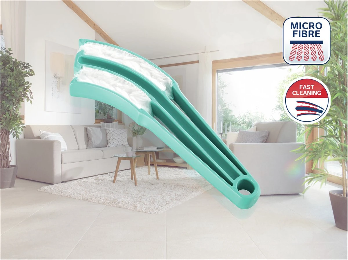 Jaloezieën reinigen is een lastige klus. Als lamellen vaak horizontaal hangen, zijn het echte stofvangers. En onaangename bronnen voor allergieën. De jaloezieënreiniger Jalousetta van Leifheit is de oplossing. Dankzij zijn speciale vorm omvat hij tegelijkertijd twee jaloezieën en reinigt zo vier vlakken met slechts één veeg. De doek van microvezels trekt stof regelrecht aan en houdt het in zijn fijne vezels vast. Zo wordt voorkomen dat stofdeeltjes alleen maar worden weggeveegd en op een andere plaats weer op de grond vallen. Ook hardnekkig vuil, zoals vetafzettingen worden moeiteloos verwijderd door de fijne vezels, zonder daarbij te krassen op de kwetsbare oppervlakken. De Jalousetta is uitgerust met een ophangmogelijkheid om deze praktisch op te bergen. Leifheit biedt 3 jaar garantie.
