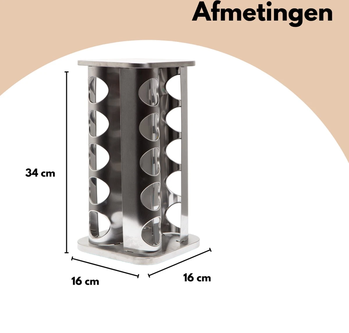 Iedereen wil toch alle kruiden binnen handbereik hebben? Of het goed georganiseerd hebben met de kruiden en specerijen. Met de kruidencarrousel van Pazzo Goods moet dat zeker lukken. Het draaibare kruidenrek in roestvrijstaal biedt ruimte voor 20 verschillende kruiden en specerijen. Alles overzichtelijk bij elkaar.