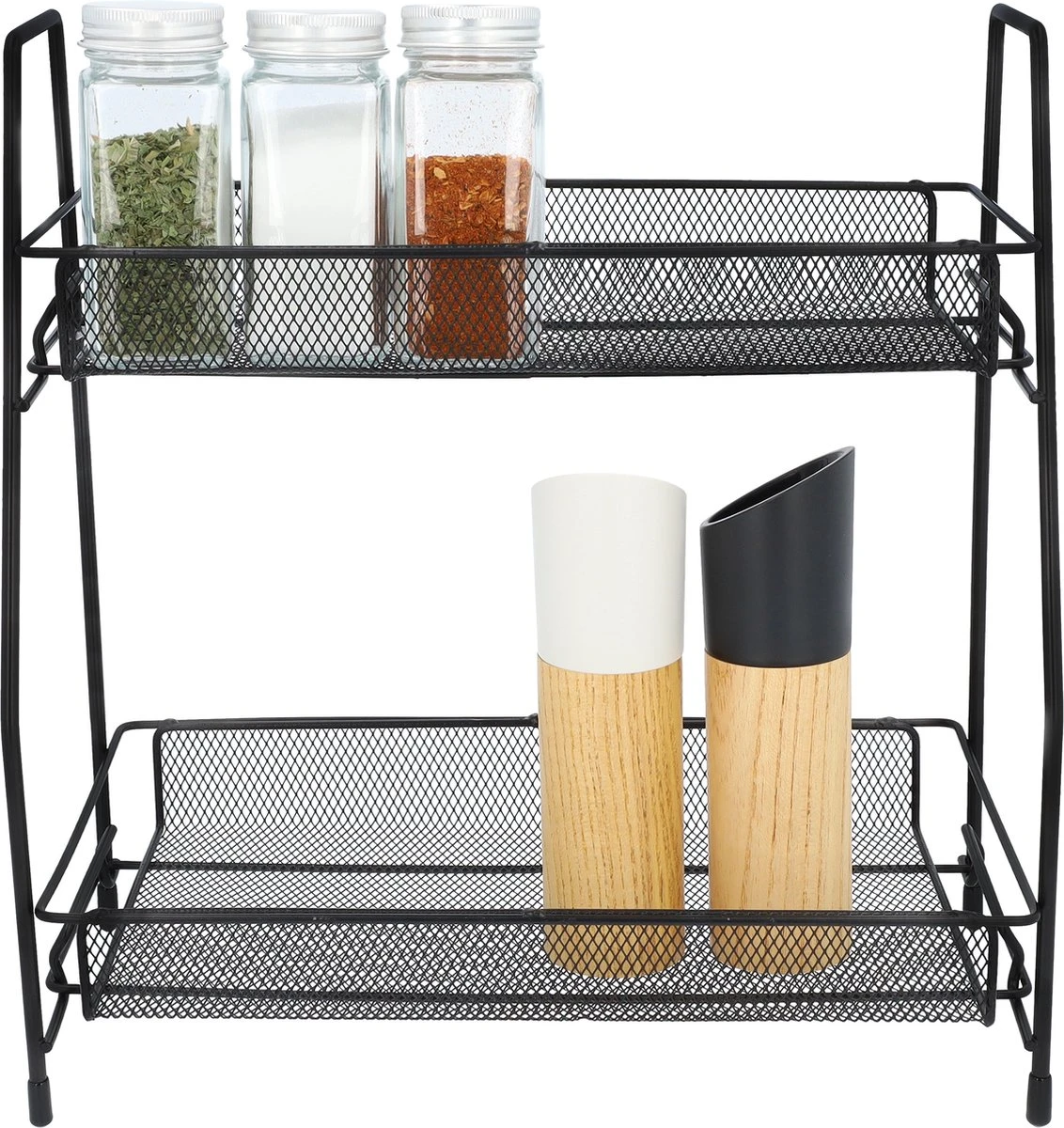 Dit staande keukenrek heeft twee bakjes waarin je allerlei spullen kwijt kunt. Door het opstaande randje blijven bijvoorbeeld kruidenpotjes erg goed staan, maar ook shampoo, parfum of crème passen prima in het rekje. Door het neutrale zwarte uiterlijk is het rekje eenvoudig te combineren in elk type interieur. Het staat overzichtelijk en helpt bij het organiseren van je woning.